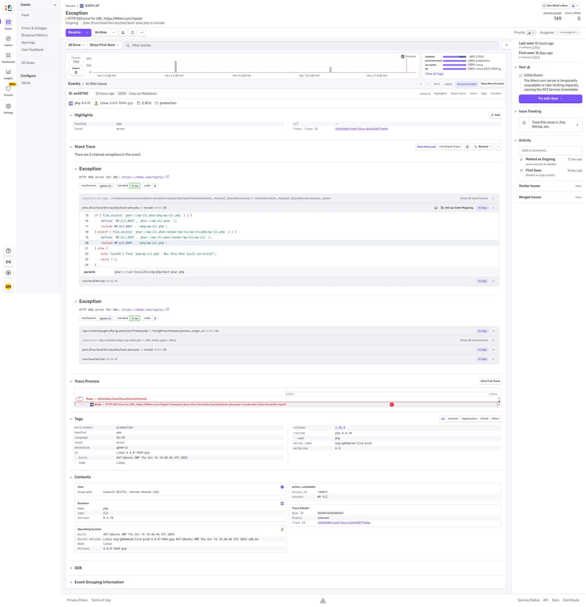 Claude fetches the issue from Sentry, analyzes the stack trace, checks the timeline of occurrences, and produces a full write-up. In this case, it determined that 749 HTTP 500/503 errors were coming from FlyingPress cache preloading during brief server availability issues – not a code bug, just infrastructure noise.