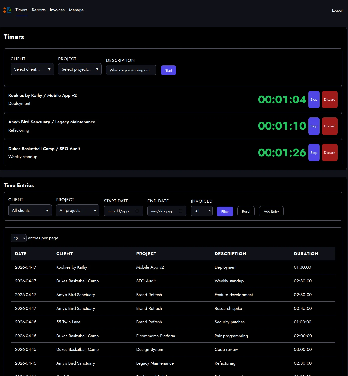 Three timers running at once for three different clients. Context switching is not a bug I work around. It is what a day actually looks like, so the tracker treats multiple live timers as a first-class feature.