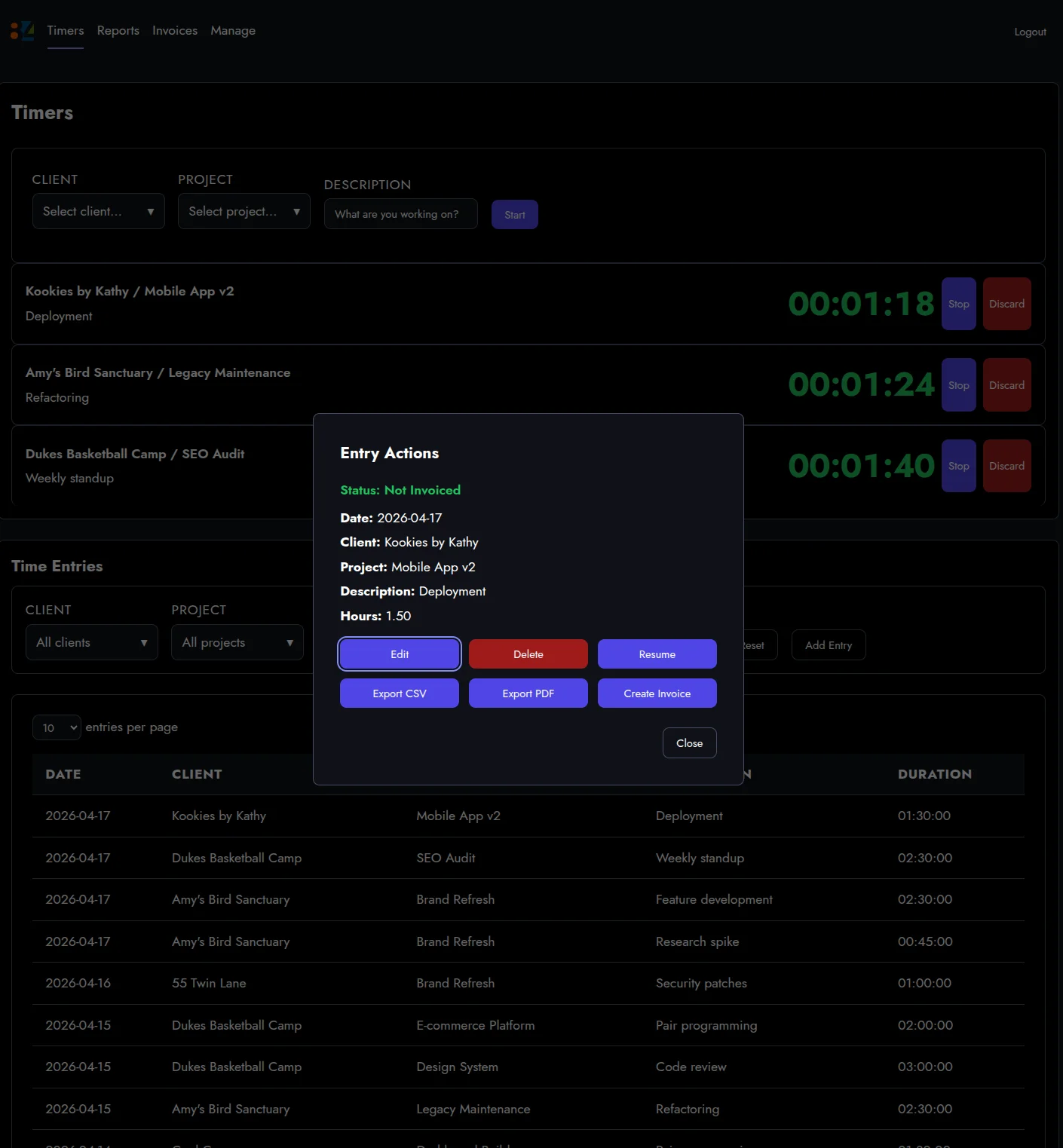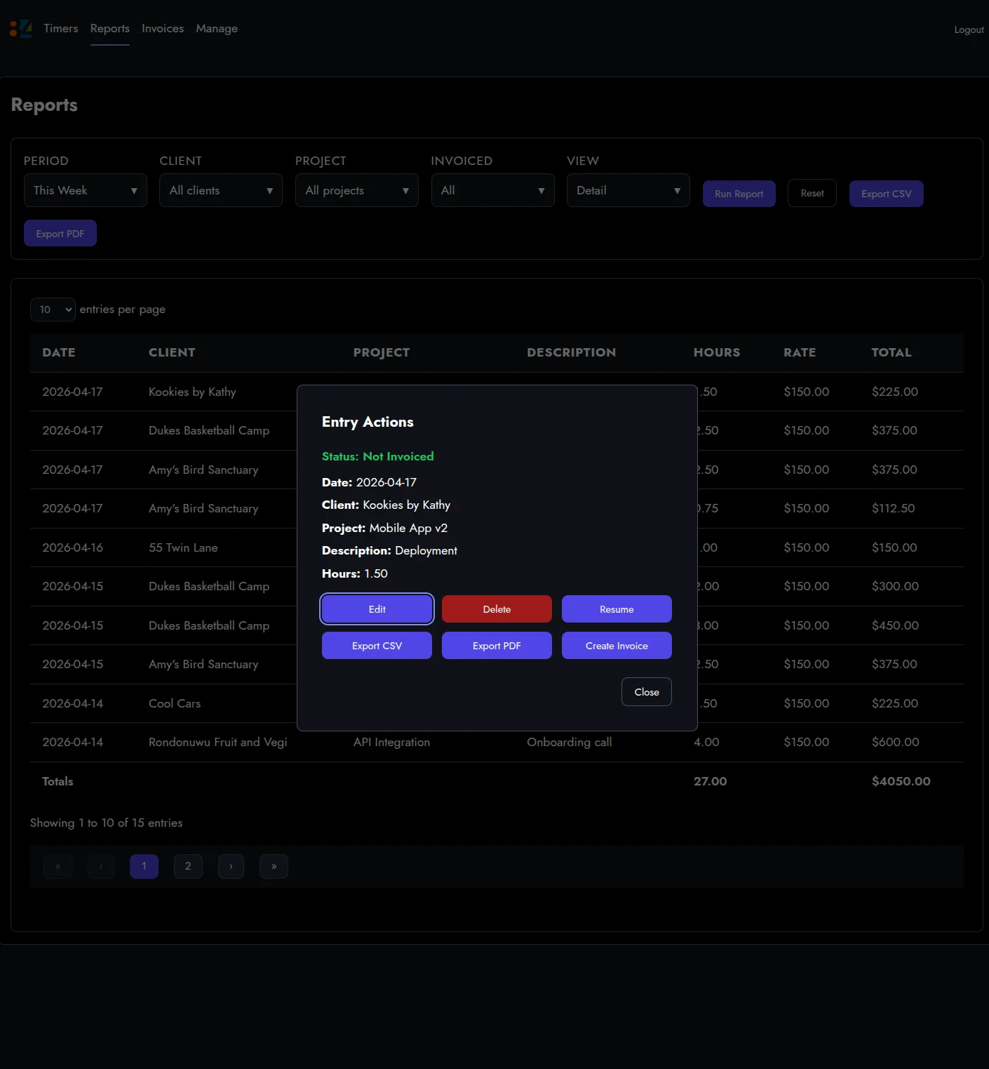 Clicking any entry opens a small menu. Edit, delete, resume the timer, export, or jump straight to invoicing.