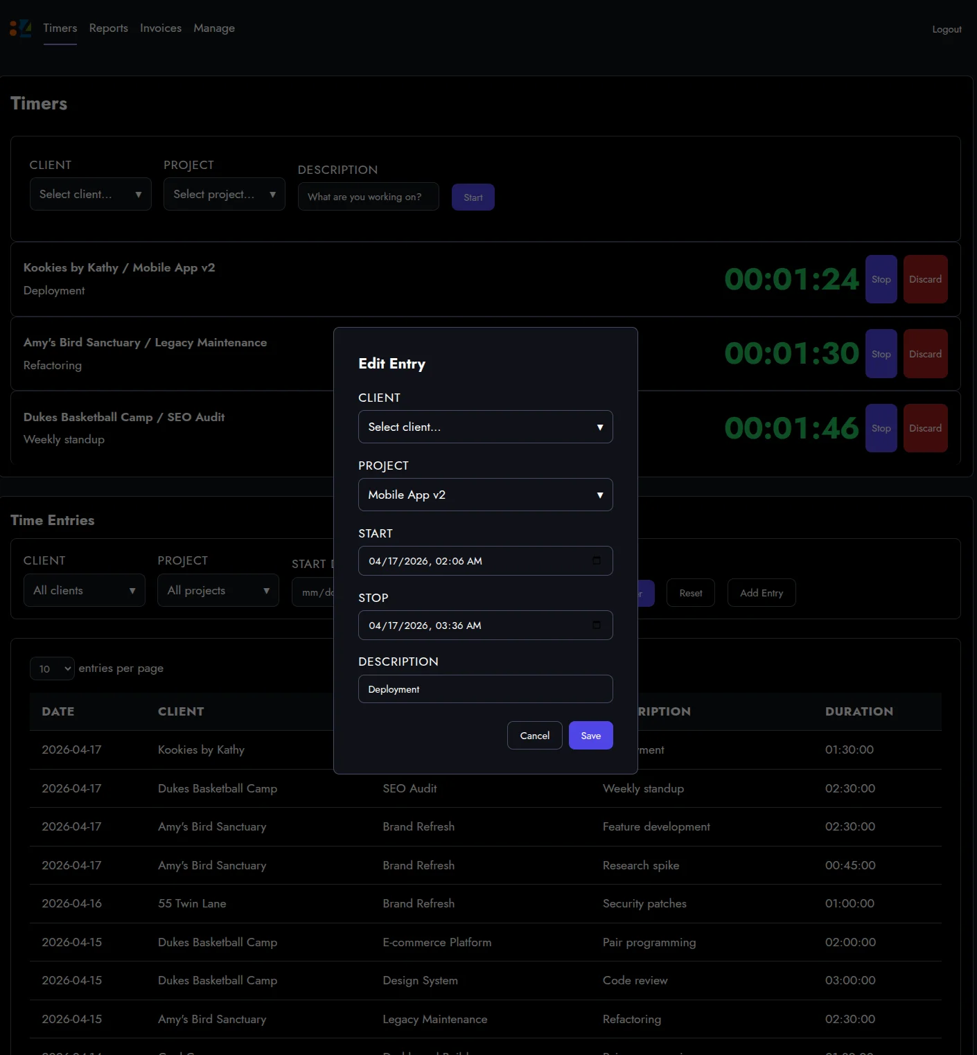 Edit opens an inline form for the client, project, start and stop times, and description. This is the boring 30% of time tracking that nobody designs well, and I wanted it to stop being a hassle.