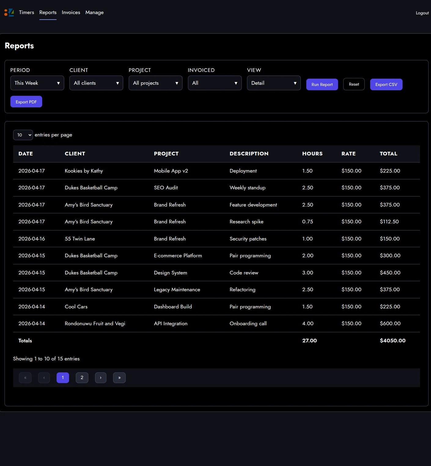 Below the timers is every entry from the current period, filterable by client, project, date range, and invoiced status.