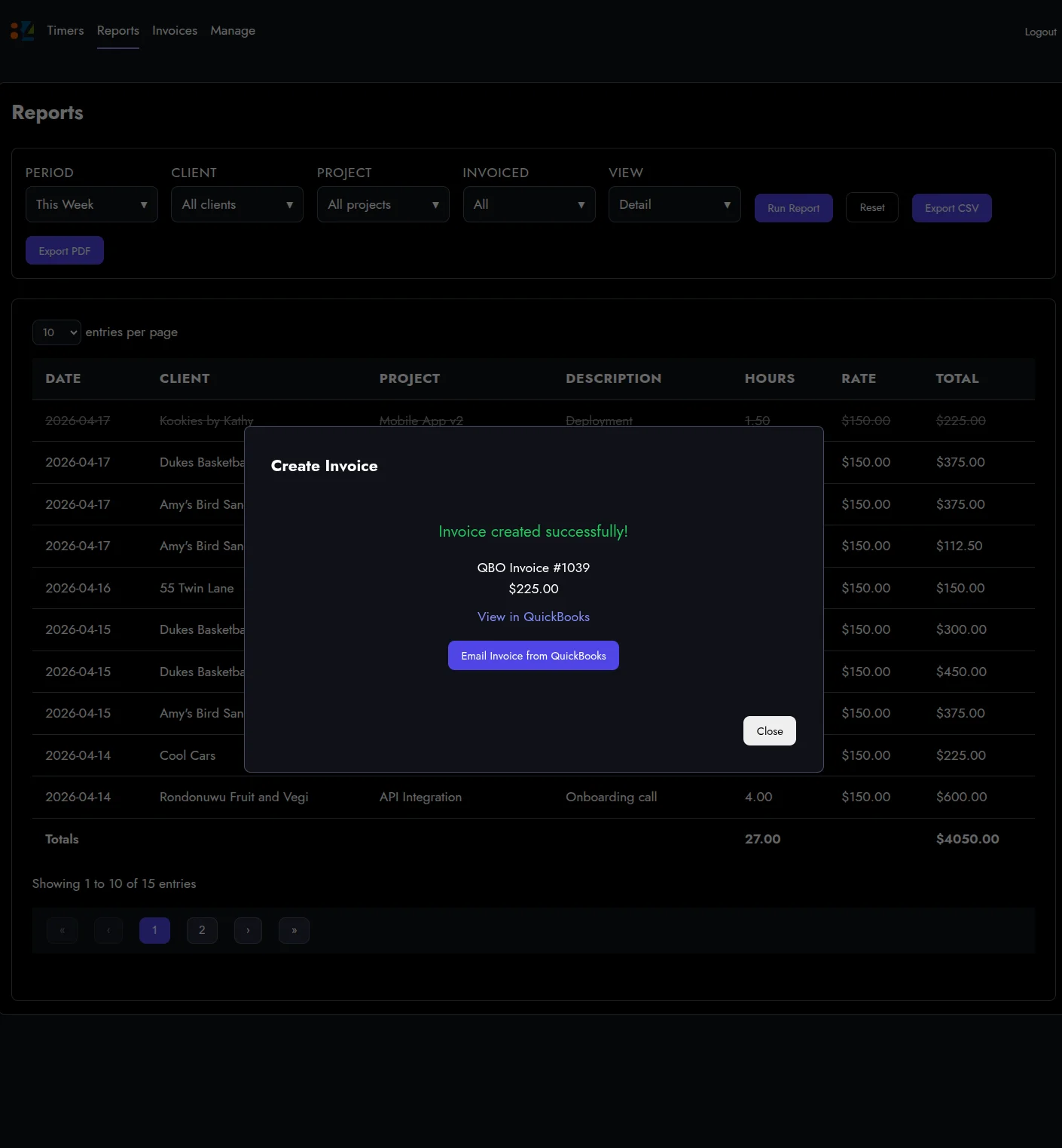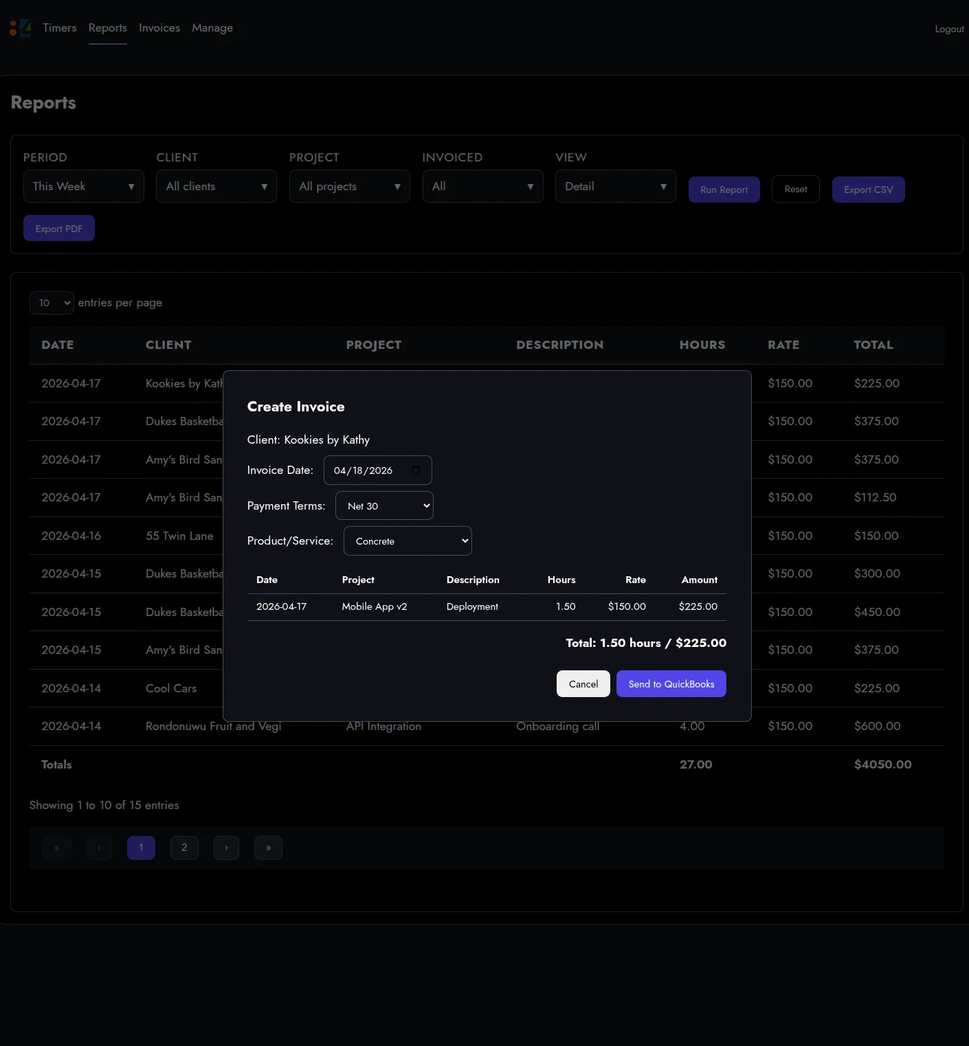 By the end you will see a timer turn into an emailed QuickBooks invoice without me leaving the app.