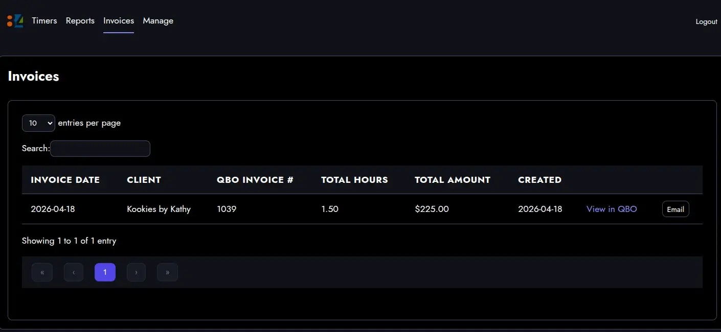 Every invoice the tracker has pushed to QuickBooks shows up on the Invoices page, searchable, with the same view-in-QuickBooks link and email button.