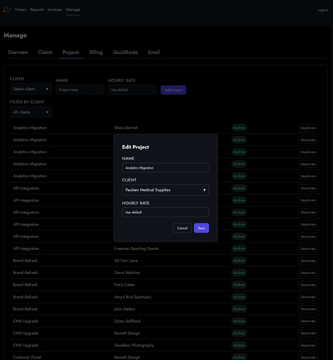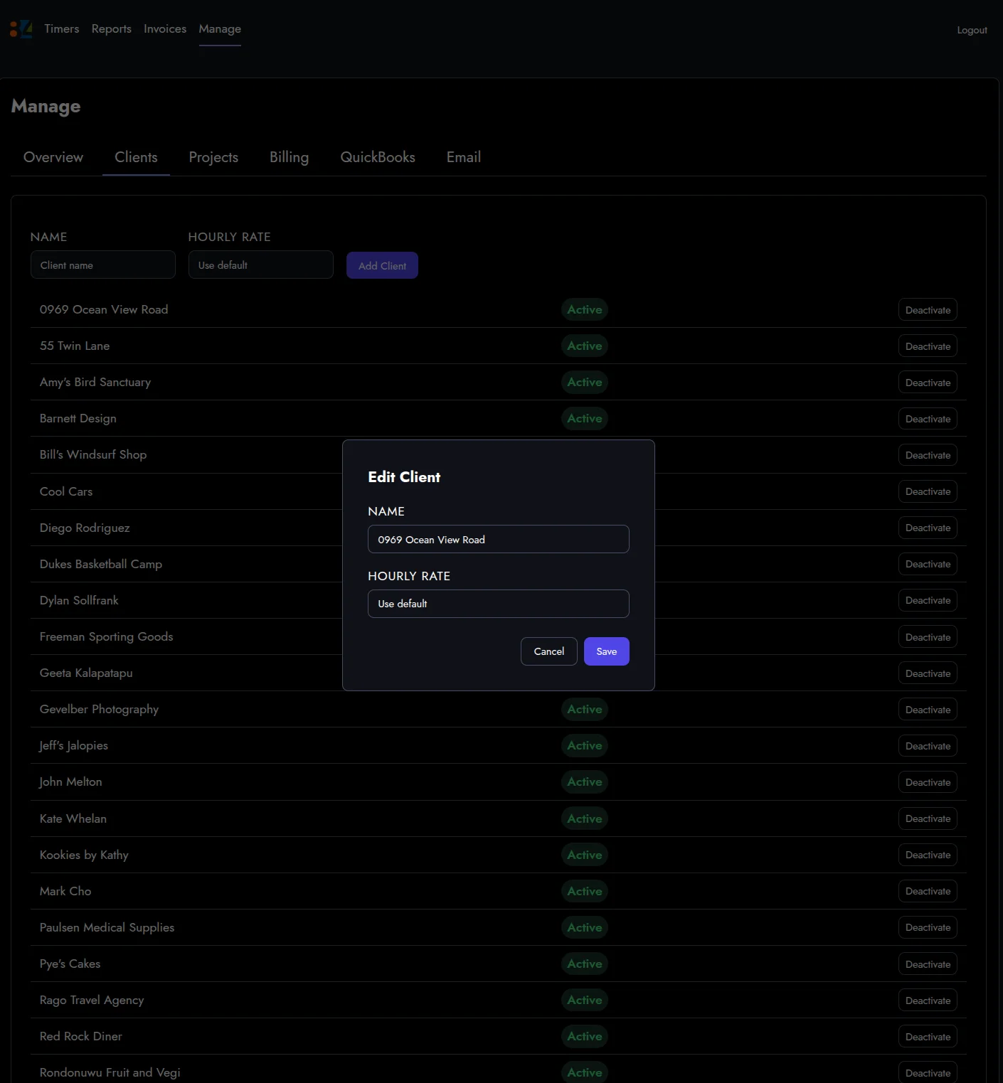 Clients have a name, an optional client-specific hourly rate, and an active or inactive status. Deactivating a client hides them from the timer dropdown without deleting any history.