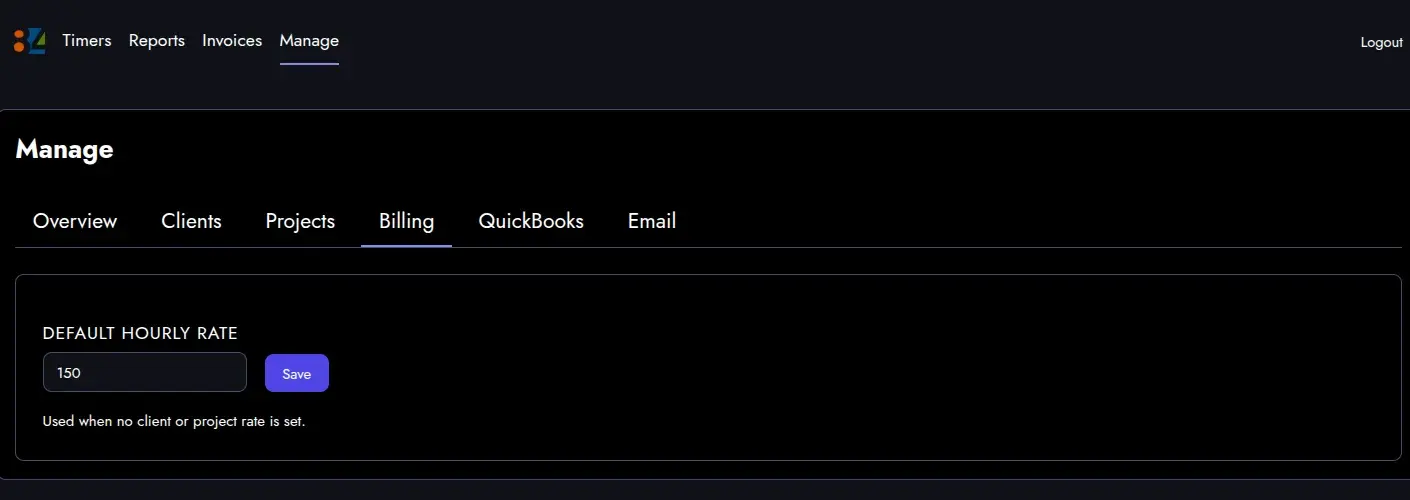 The default hourly rate lives under Billing. Used whenever a client or project has not set their own.