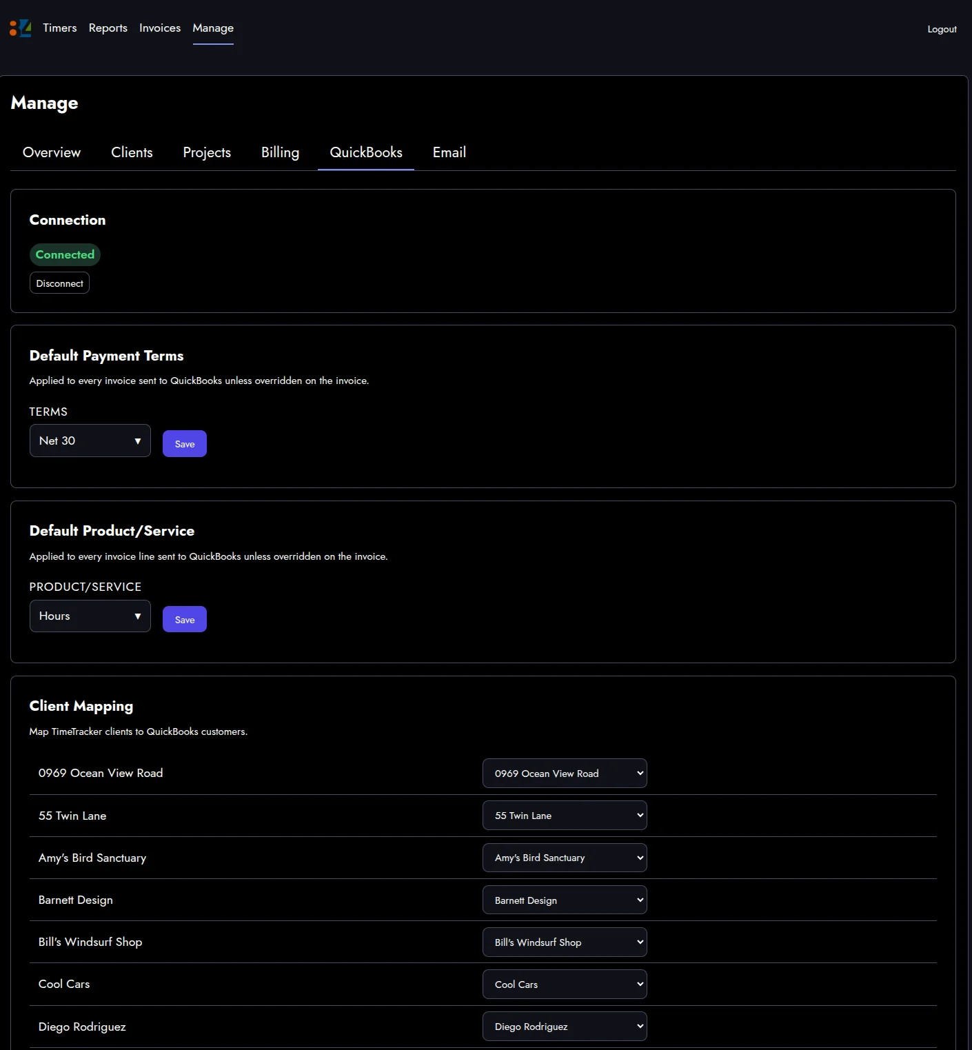 The QuickBooks tab holds the connection state, default payment terms, the default product or service, and a row for every client in the tracker mapped to the matching customer in QuickBooks. Once the mapping is set, invoices go to the right place automatically.