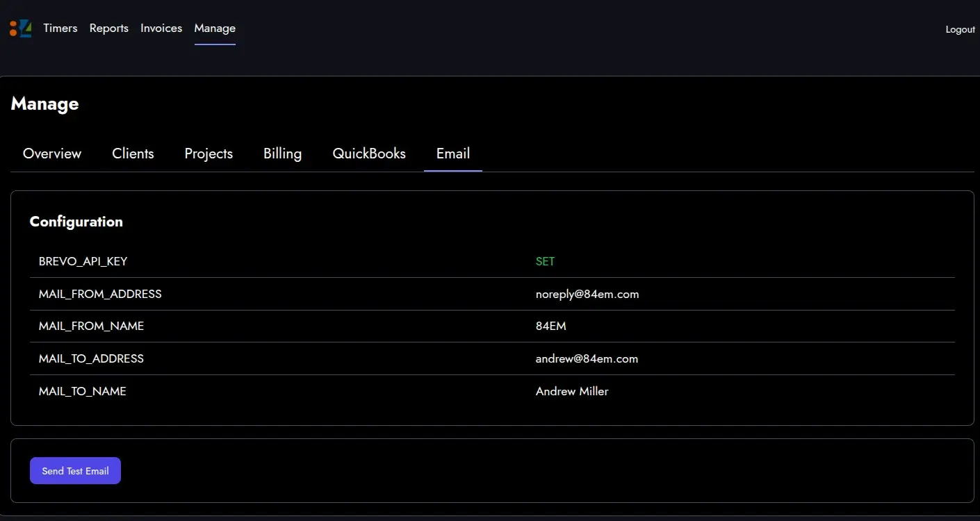 Email is the last tab. Sender address, reply-to, the key for the service that delivers the mail. A Send Test Email button because I have been burned by silently broken notification pipelines before.